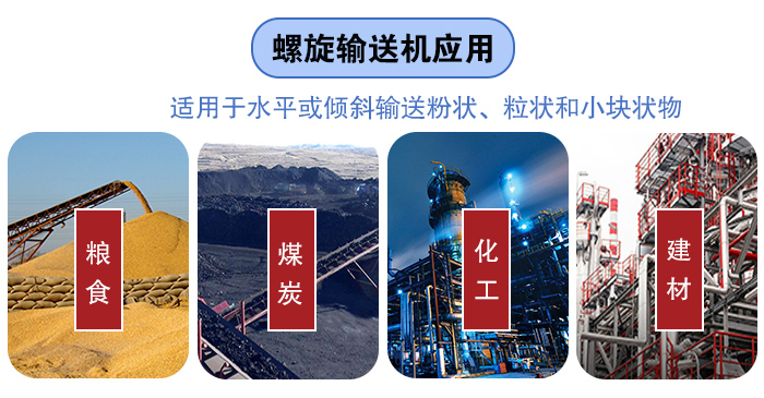 螺旋輸送機廣泛應用于各行業,如建材、化工、工業、煤礦炭、糧食等行業,適用于水平或傾斜輸送粉狀、粒狀和小塊狀物料,如粉煤灰、石灰、水泥、飼料、肥料、砂漿、糧食、面粉等,物料溫小于200℃。