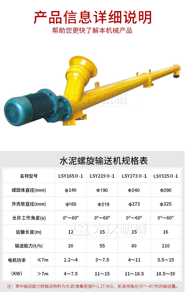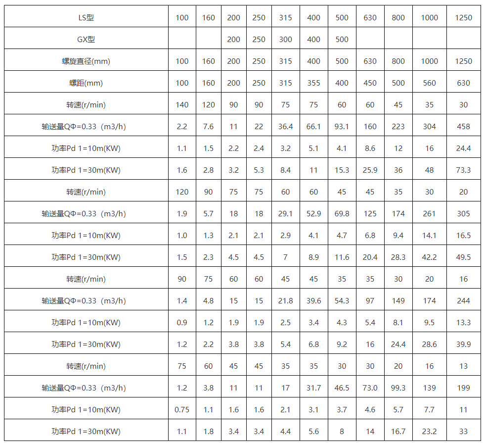 管式螺旋輸送機(jī)適用于水平或傾斜輸送粉狀、粒狀和小塊狀物料,如煤、灰、渣、水泥、糧食等,物料溫度小于200℃,不適宜輸送易變質(zhì)的、黏性大的、易結(jié)塊的物料。參數(shù)如下:
