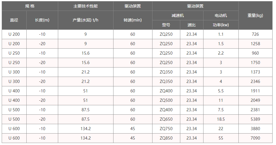U型螺旋輸送機(jī)工作時(shí),電機(jī)帶動旋轉(zhuǎn)的螺旋葉片將物料推移而進(jìn)行輸送,螺旋輸送機(jī)旋轉(zhuǎn)軸上焊的螺旋葉片,葉片的面型根據(jù)輸送物料的不同有實(shí)體面型、帶式面型、葉片面型等型式。使物料不與螺旋輸送機(jī)葉片一起旋轉(zhuǎn)的力是物料自身重量和螺旋輸送機(jī)機(jī)殼對物料的摩擦阻力。參數(shù)如下: