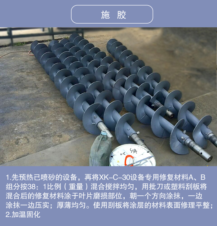1.先預熱已噴砂的設備,再將XK-C-30設備專用修復材料A、B組分按38:1比例(重量)混合攪拌均勻,用批刀或塑料刮板將混合后的修復材料涂于葉片磨損部位,朝一個方向涂抹,一邊涂抹一邊壓實;厚薄均勻。使用刮板將涂層的材料表面修理平整;