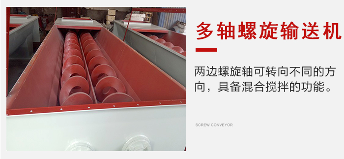 而多軸螺旋輸送機則是兩邊螺旋軸轉(zhuǎn)向不同的方向,具體混合攪拌的功能。