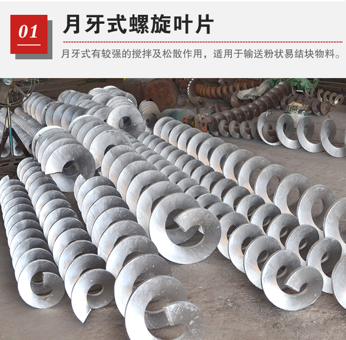 月牙式有較強的攪拌及松散作用,適用于輸送粉狀易結塊物料。