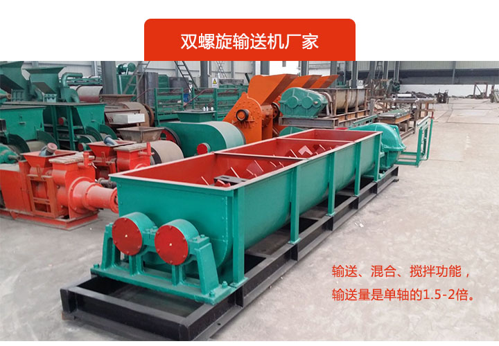 雙軸螺旋輸送機是利用兩根螺旋軸(一正一反)輸送物料,同時具備輸送、混合、攪拌功能,不易堵料;輸送量是單軸的1.5-2倍。