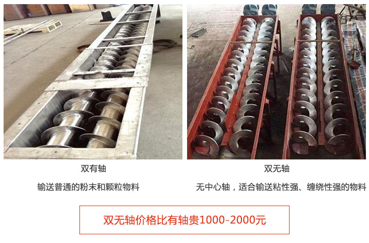 注:雙無軸螺旋輸送機(jī)價(jià)格比有軸貴1000-2000元,因?yàn)椴捎脽o軸設(shè)計(jì),可解決易纏繞物料的輸送,且設(shè)計(jì)難度比有軸大。