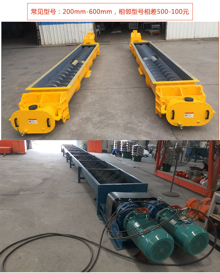 雙螺旋輸送機(jī)常見有200mm-600mm等6種型號(hào)規(guī)格;型號(hào)越大輸送量越高,可達(dá)458立方米/小時(shí),用戶可根據(jù)實(shí)際情況選擇適合的型號(hào),此外也可支持特殊型號(hào)定制。