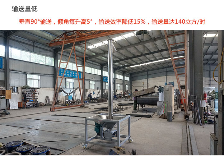 垂直螺旋輸送機采用垂直輸送的方式,其傾角為90°,在輸送中,輸送機的傾角每升高5°,輸送效率就會降低15%,因而造成輸送量較低,只能達140立方/時。