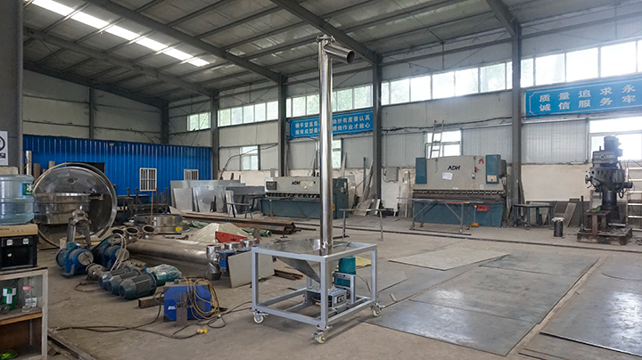 立式螺旋輸送機的進料方式為強制性進料,當輸送機工作時,水平垂直螺旋和垂直螺旋做旋動,被輸送的物料從水平部分的進料口處加入,通過轉動著的水平喂料螺旋送入輸送機的垂直部分中,接著利用垂直螺旋將物料進料方式為自流式,當輸送機工作時,水平喂料螺旋做旋動,被輸送的物料從進料口處進入,利用垂直螺旋槳物料向上推至卸料口處進行卸料。