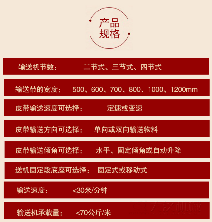 輸送機節數:二節式、三節式、四節式。 輸送帶的寬度:500、600、700、800、1000、1200mm。 皮帶輸送速度可選擇:定速或變速。 皮帶輸送方向可選擇:單向或雙向輸送物料。 皮帶輸送傾角可選擇:水平、固定傾角或自動升降。 輸送機固定段底座可選擇:固定式或移動式。 輸送速度:<30米/分鐘。 輸送機承載量:<70公斤/米。