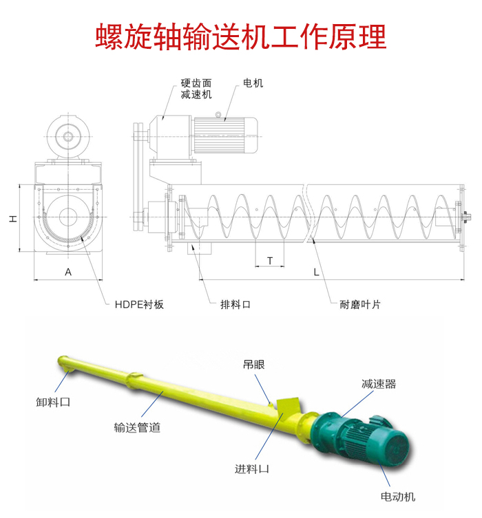 螺旋軸輸送機主要由驅動裝置,機殼、蓋板、螺旋軸、螺旋葉片、進料口、出料口等部件組成。