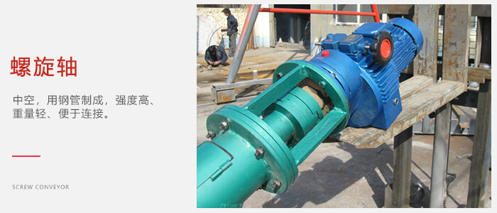 螺旋軸:中空,用鋼管制成,強度高、重量輕、便于連接。在軸與軸的連接處和安裝軸承處使用一小段實心軸。在連接處將實心軸伸入空心軸內用高強度的螺栓按相互垂直方向對穿空心軸與實心軸來固定連接螺旋軸。